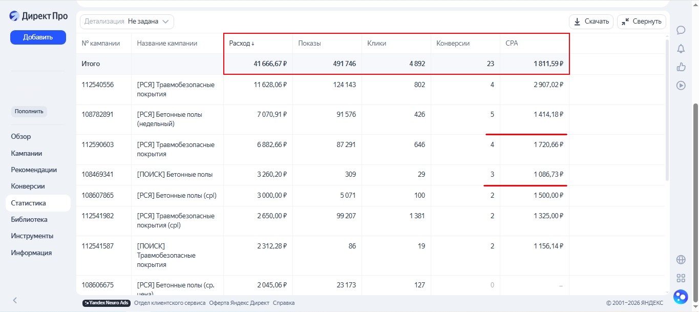 По рекламе лучше всего себя показала Единая перфоманс-кампания с показами в Рекламной Сети Яндекса (РСЯ) на аудиторию тех, кто интересовался в ближайшее время устройством бетонных и травмобезопасных полов. На рисунке 2 я подчеркнул кампании, где заявка вышла дешевле. Также несколько заявок принести кампании с оплатой за лид фиксированно. Приняли решение внести правки в рекламу и продолжать.